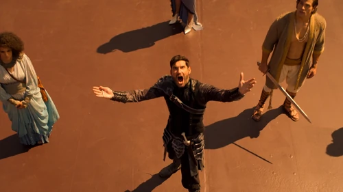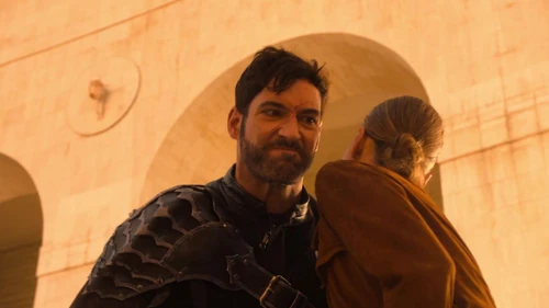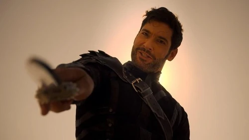 Michael follows after Lucifer when he shot higher into the sky. He rains down blows on to the staff, eventually breaking it in half. After Lucifer fell to the concrete in front of the arched entrance, Michael stood over him, bidding his brother farewell. He swung the sword down, only for Lucifer to grab Michael's hands, halting him. As they struggle, Michael tells him that he wasn't going to be able to relieve him of the sword, only to be surprised by Chloe taking the key out, causing the blade to fall to the ground.